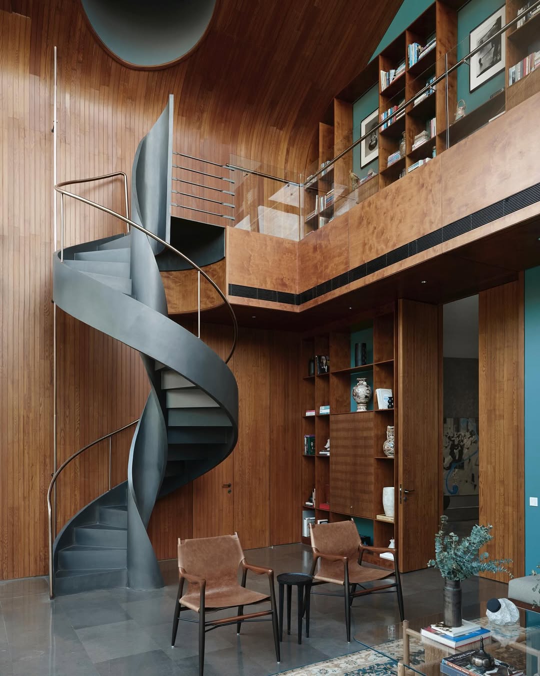 A sleek, matte-gray spiral staircase rises elegantly within a double-height glass atrium, surrounded by warm wooden paneling and lush outdoor views.